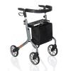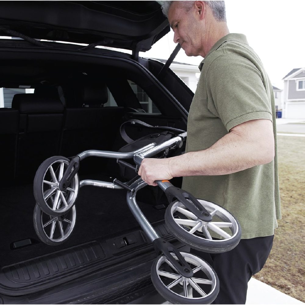 De fabricación Sueca su estilo europeo no pasa desapercibido desde sus firmes cuatro ruedas de uso exterior hasta su asiento integrado con respaldo y espacio para almacenar un bastón y un bolso para almacenamiento.