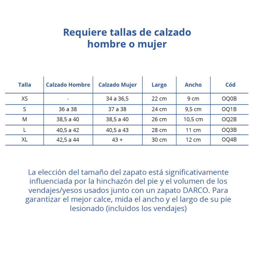 - Importante: la elección del tamaño del zapato está significativamente influenciada por la hinchazón del pie y el volumen de los vendajes/yesos usados junto con un zapato darco. para garantizar el mejor calce, mida el ancho y el largo de su pie lesionado (incluidos los vendajes)